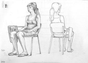 Gdy rysujesz z natury musisz tak siedzieć lub stać, żeby łatwo przenosić wzrok z arkusza rysunkowego na temat i z powrotem – czy to będzie układ pudełek, siedząca postać, wnętrze architektoniczne, budynek lub wnętrze ulicy. Aby poprawnie narysować obserwowany temat powinieneś nieustannie kontrolować to, co dzieje się na arkuszy, i analizować to, co widzisz. Warto zatem co pewien czas odejść od deski na kilka kroków i skontrolować z odległości stan rysunku.